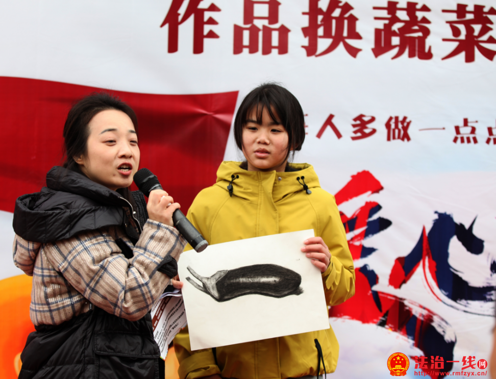 之后,学生们带着自己的作品去换取蔬菜,用自己创作的劳动为农民伯伯减负,奉献出自己的一份爱心。